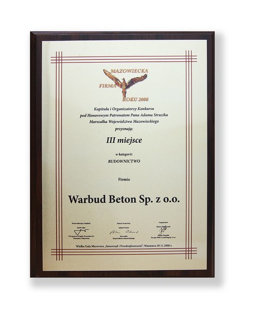 Orzeł Mazowieckiego Biznesu 2008 - starania spółki zostały docenione w konkursie „Mazowiecka Firma Roku”. Warbud Beton zdobył III miejsce i brązową statuetkę za oferowanie usług i produktów na najwyższym poziomie.